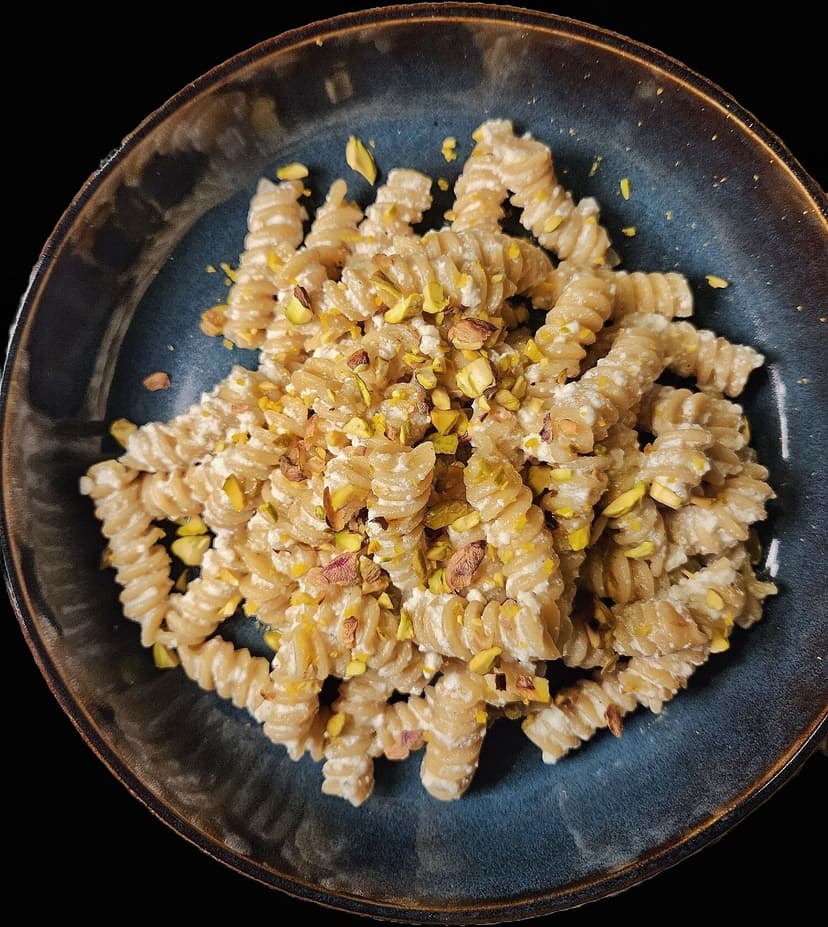 Fusilli integrali con crema di ricotta all’arancia e granella di pistacchi